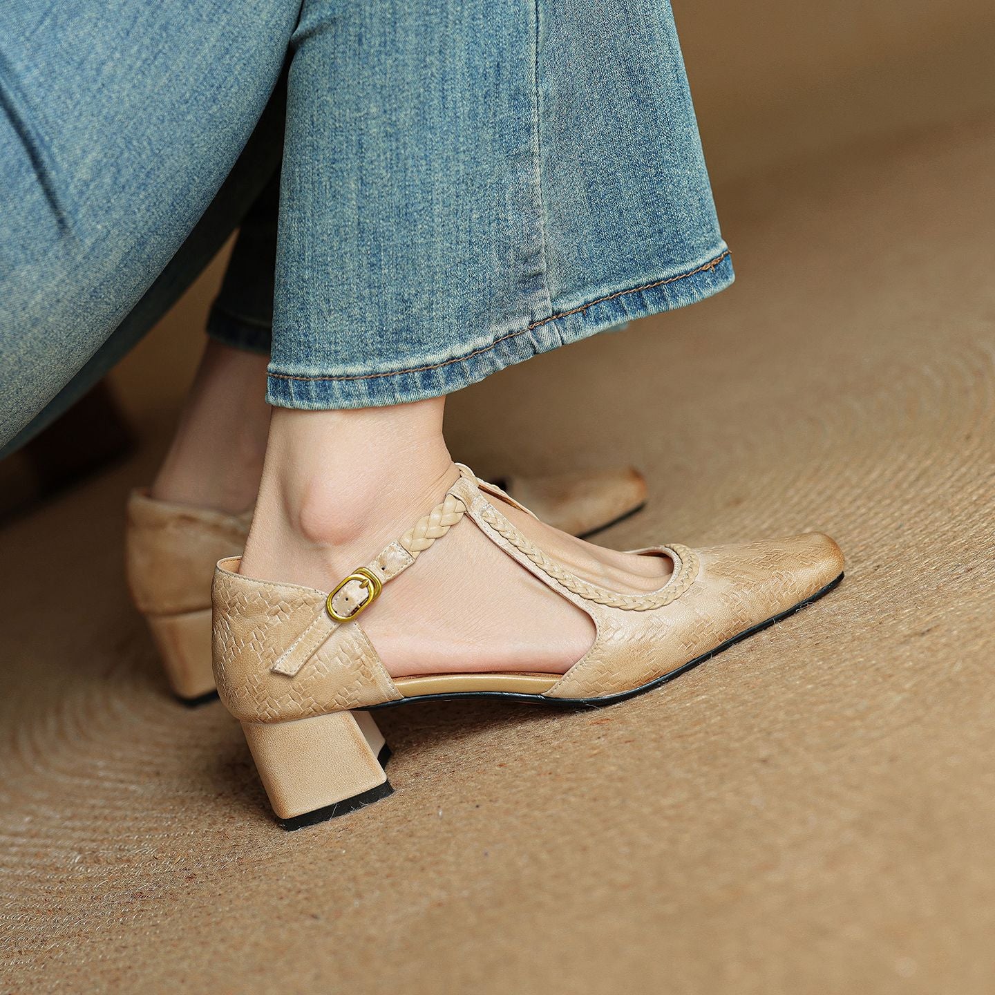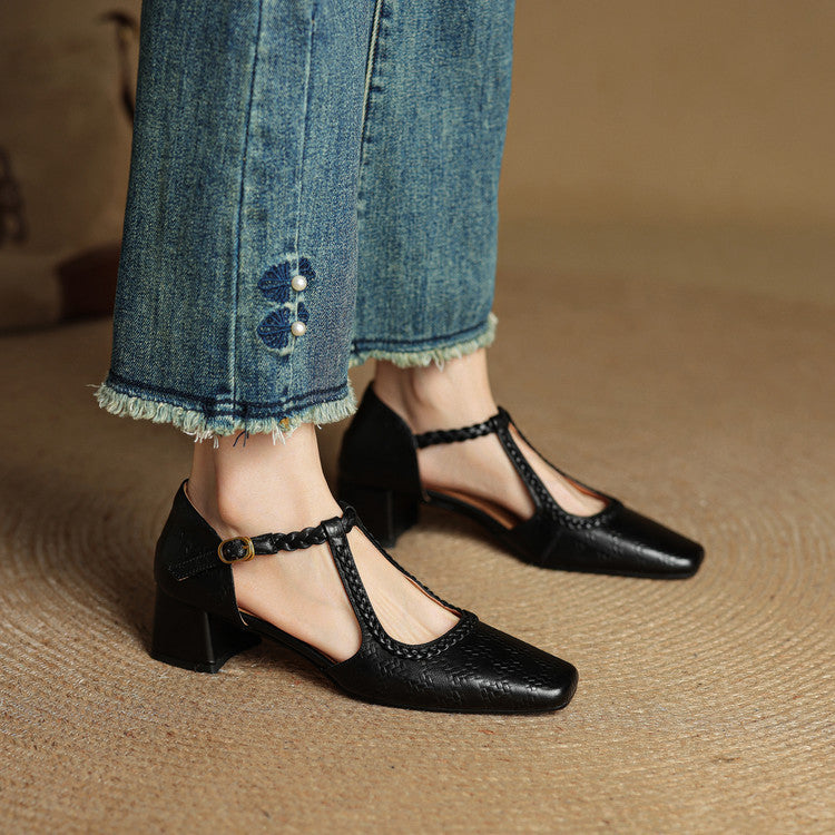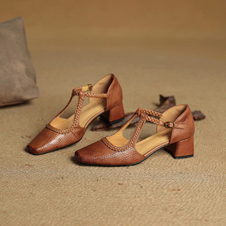 Crafted from supple genuine leather, these woven T-strap heels blend old-world charm with modern comfort. The sculpted silhouette and braided strap create a refined, feminine shape that complements everything from dresses to tailored denim.