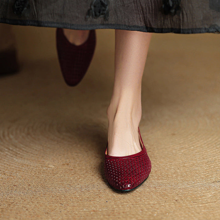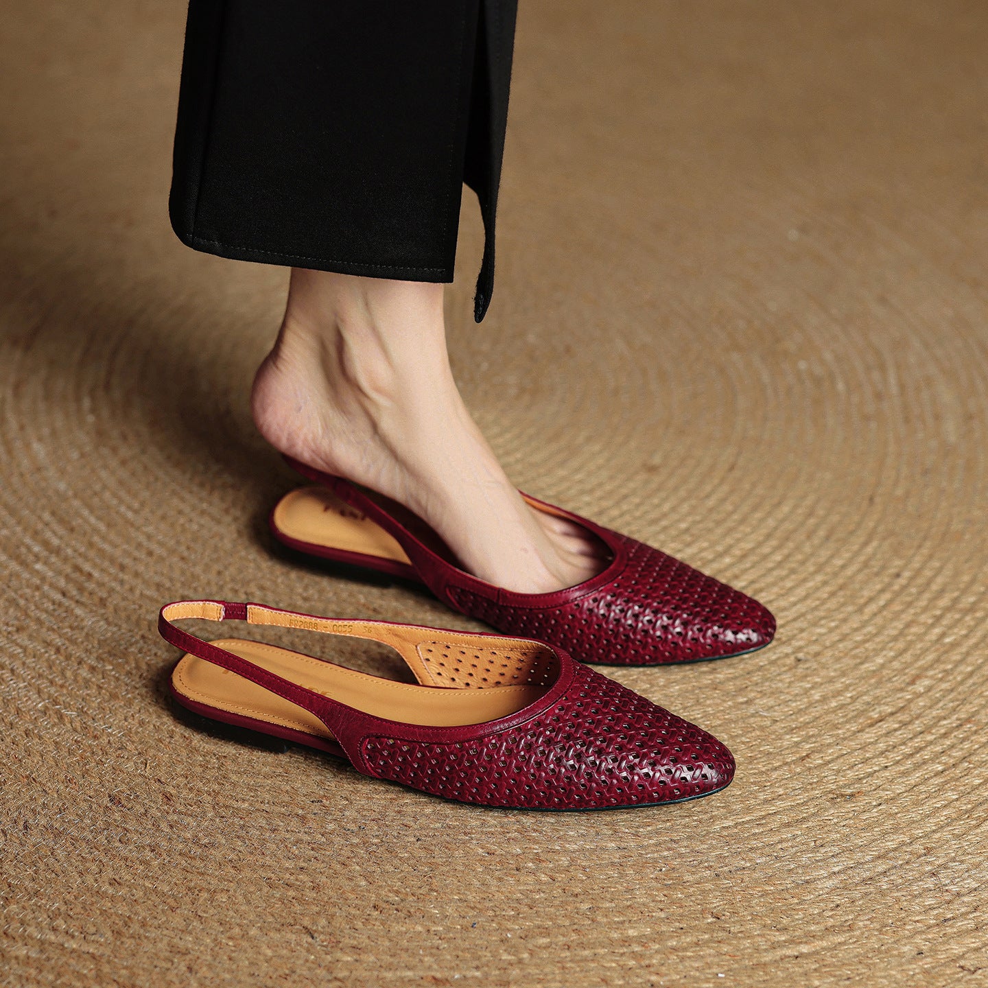 Crafted from genuine leather, these slingback flats feature a beautifully woven upper that offers both breathability and visual texture, creating a refined look that feels effortless and elevated. The open back and slim sling strap keep them secure while maintaining a light, airy feel perfect for warm days.