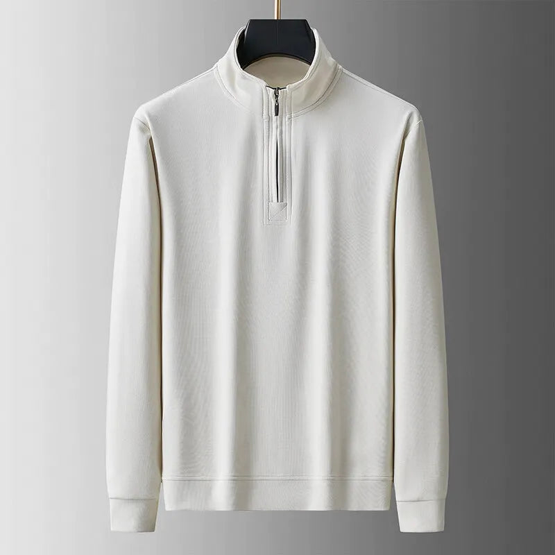 A minimalist and versatile quarter-zip pullover, perfect for layering. Its simple design features a high collar and a smooth zip closure, offering both comfort and a clean, modern style. Made from a soft knit fabric, this sweater is an easy staple for any casual or smart-casual look.