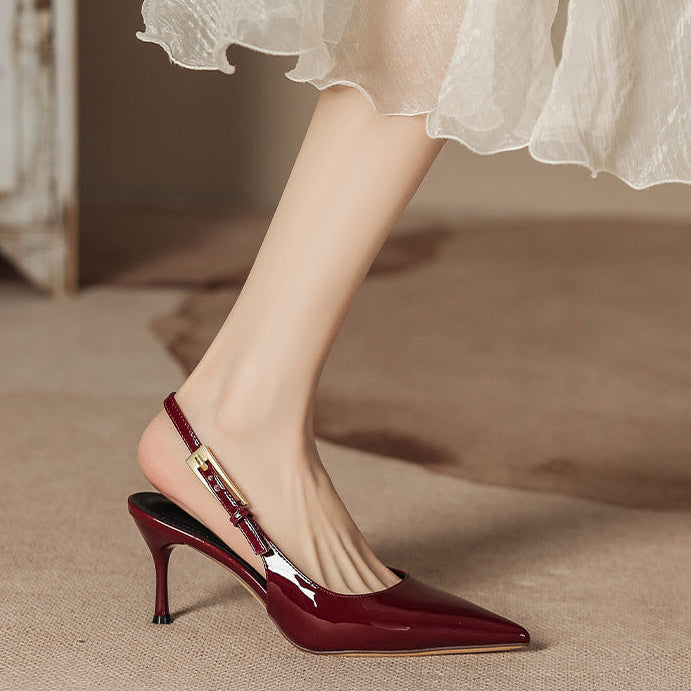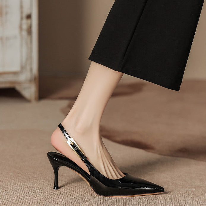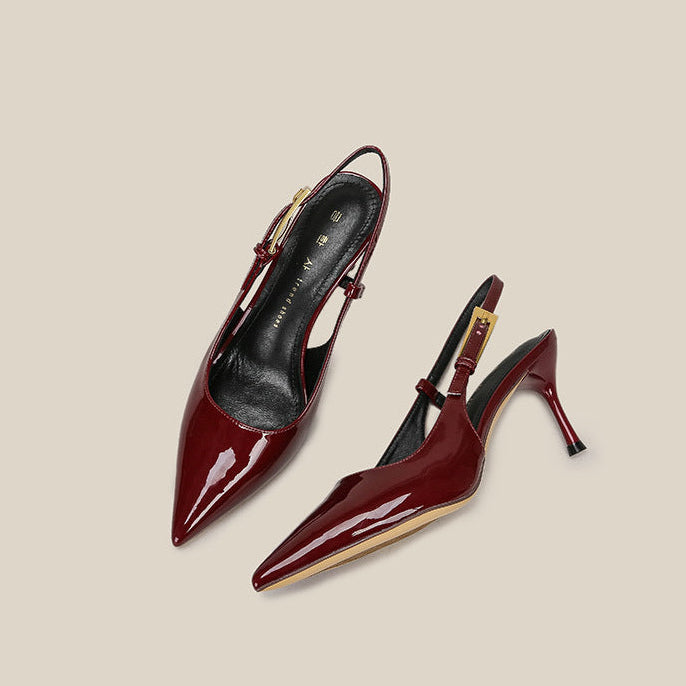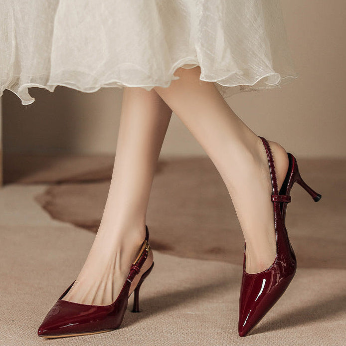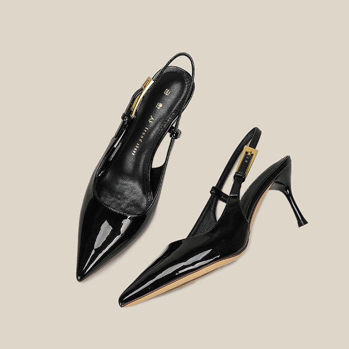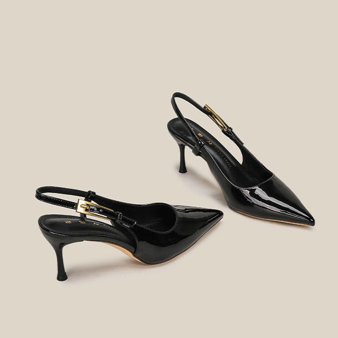 Crafted with a glossy leather finish, this heel pairs a sharp silhouette with a delicate slingback strap for secure comfort. The pointed toe elongates the leg, making it a timeless piece for any occasion.
